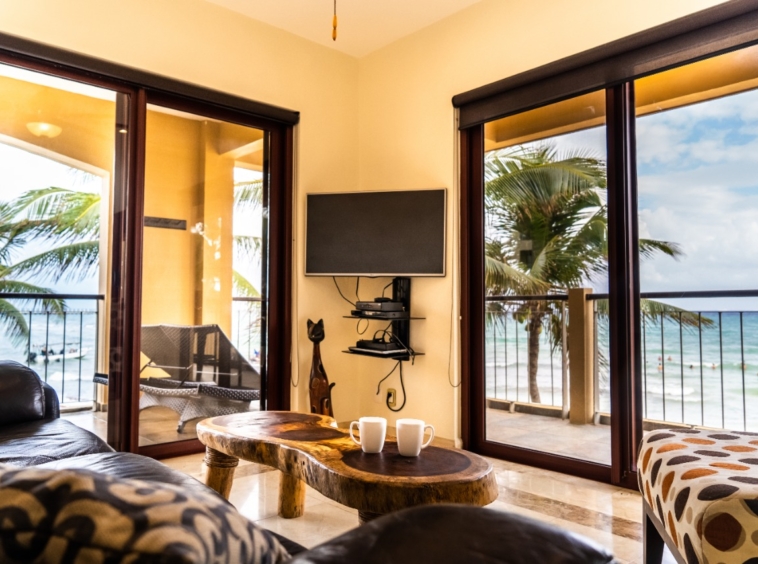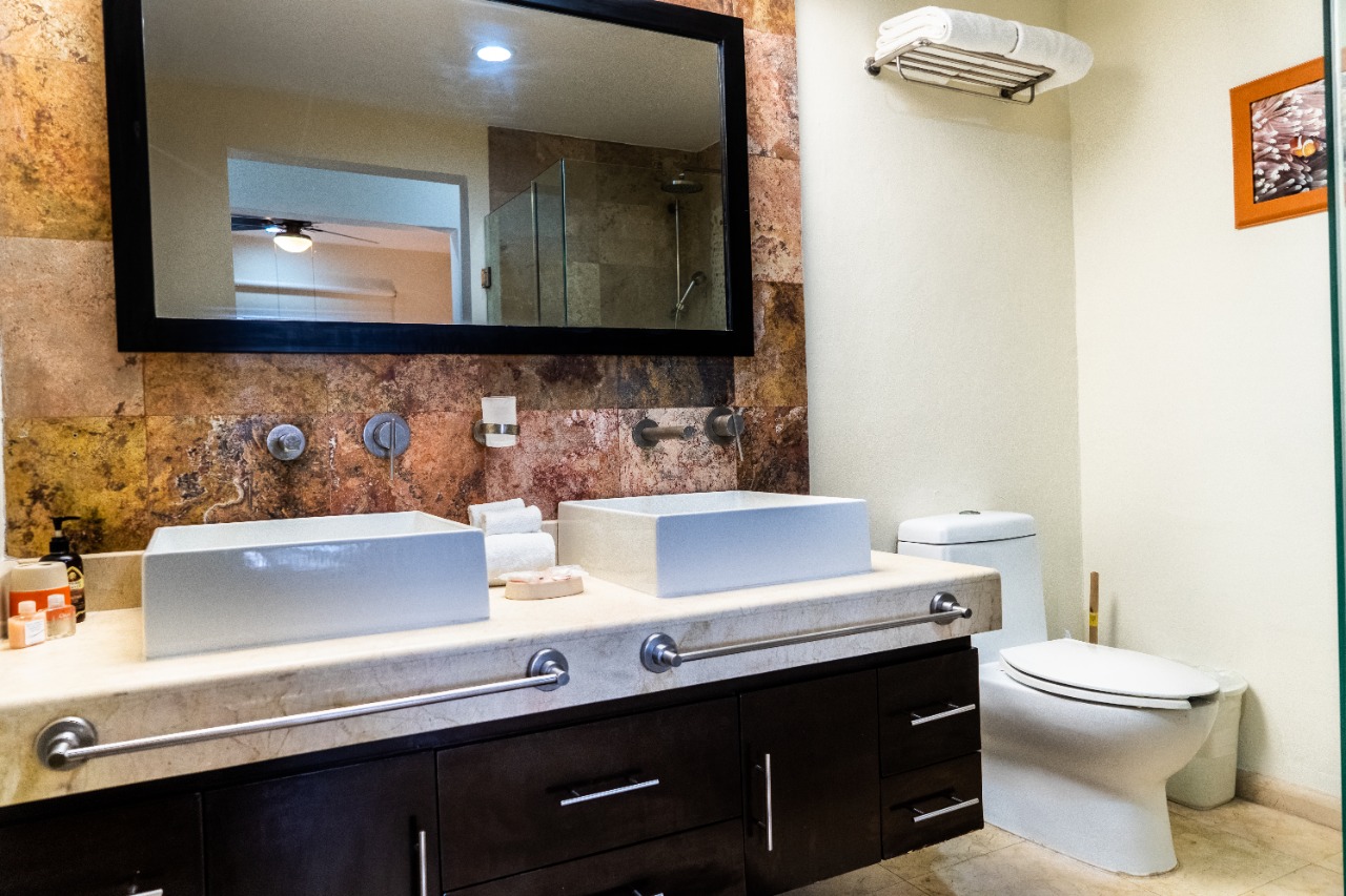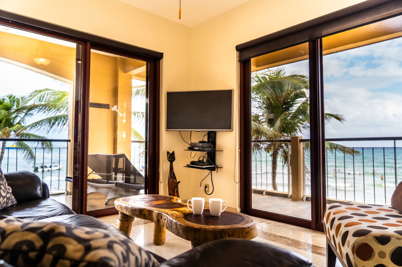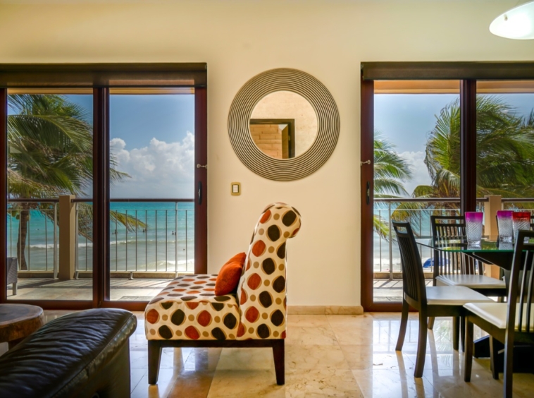 A beautiful 2-bedroom, 2-bathroom vacation rental perched just above the beach on the front corner of El Faro! The private wraparound terrace offers panoramic views of the captivating Caribbean Sea and the infinity pool and garden area below. Spacious main entrance, modern kitchen, and open dining area with access to the terrace. The living area features a flat-screen TV and reclining sofa for optimal relaxation. Beautifully decorated and furnished to make you feel at home, with textured painted walls, bright colors, and tribal accents. Enjoy the ocean breeze and the gentle sound of waves lapping the shore while you prepare dinner! Both bedrooms feature wall-mounted flat-screen TVs and adjoining bathrooms with rainfall showers. Watch incredible Caribbean sunrises from the comfort of the master bedroom! Building amenities include a pool, massage therapy, laundry facilities, and reserved underground parking. Centrally located in Playa del Carmen, one block from the famous 5th Avenue with endless shopping, dining, and entertainment options! Travertine marble floors extend to your private outdoor terrace, the fully equipped stainless steel chef’s kitchen with granite countertops, original paintings, and many other fine details, all to provide impeccable quality and international style. Even the terrace is furnished with the finest outdoor comforts for lounging and dining al fresco. The common area patio features beautiful landscaping with palm trees, tropical plants, flowers, and a large, refreshing infinity-edge pool and hot tub. Complementary outdoor tables and lounges are provided for relaxing and entertaining around the pool. One king-size bed in the master bedroom and one queen-size bed in the second bedroom. (Parking Fee – $15 USD per night)