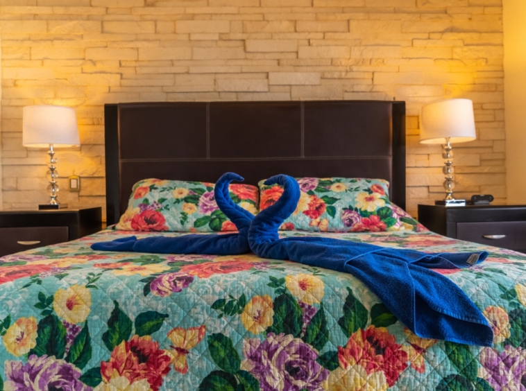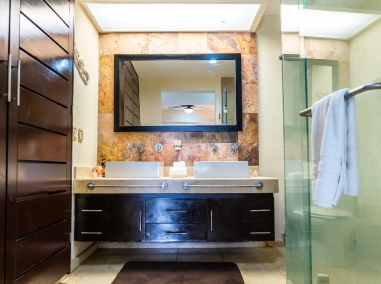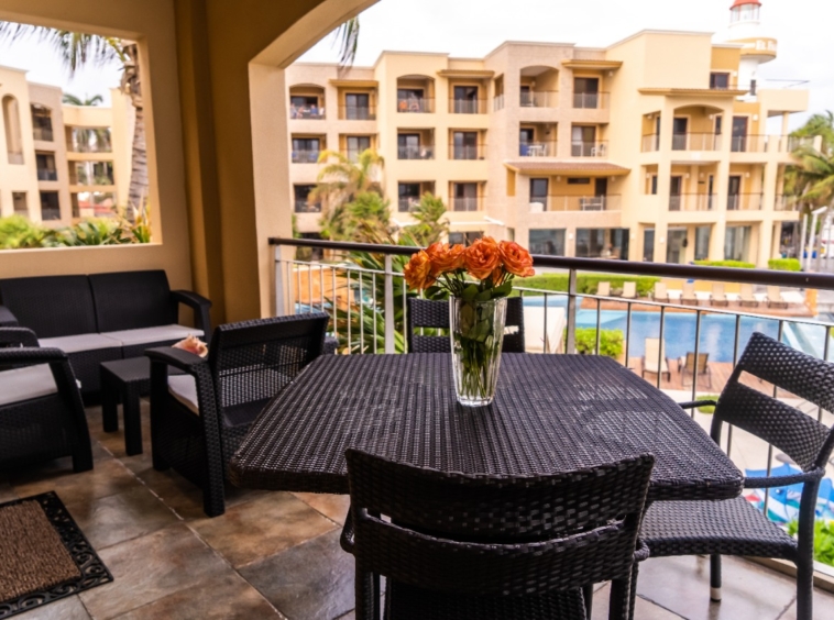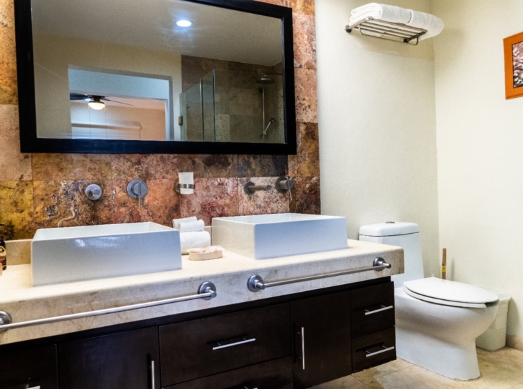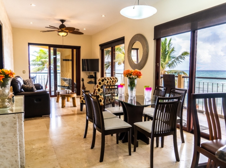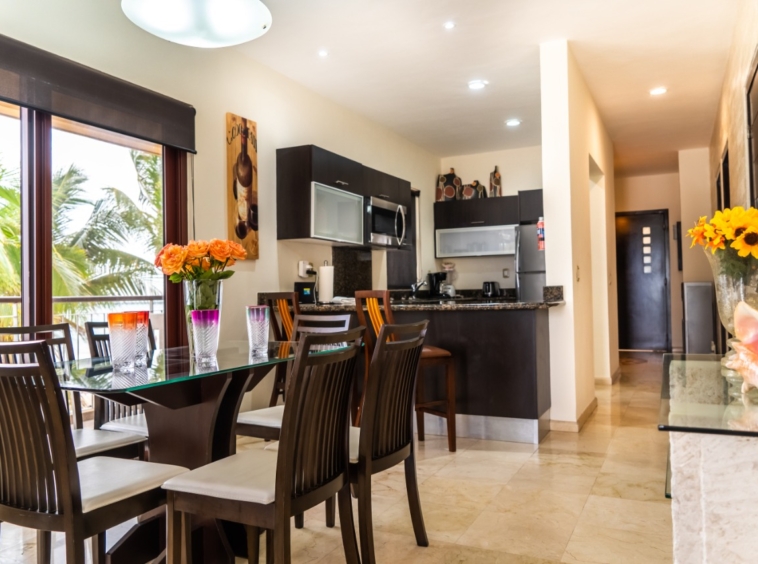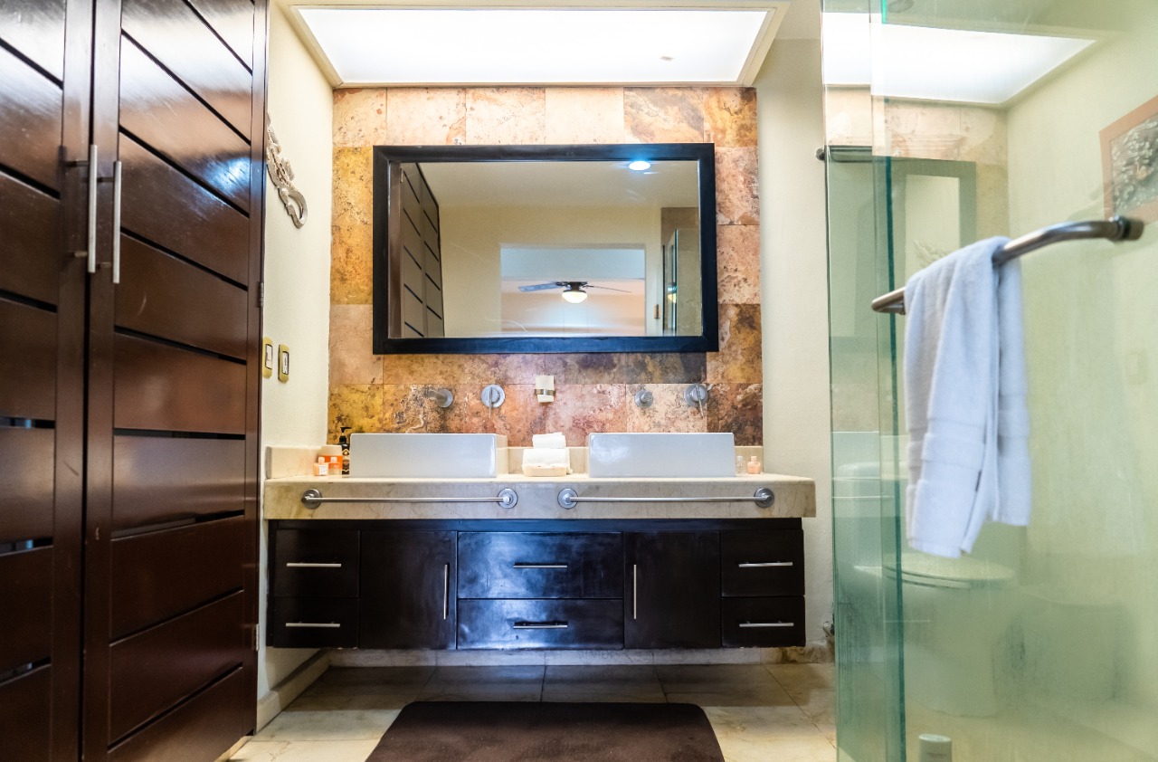 A beautiful 2-bedroom, 2-bathroom vacation rental perched just above the beach on the front corner of El Faro! The private wraparound terrace offers panoramic views of the captivating Caribbean Sea and the infinity pool and garden area below. Spacious main entrance, modern kitchen, and open dining area with access to the terrace. The living area features a flat-screen TV and reclining sofa for optimal relaxation. Beautifully decorated and furnished to make you feel at home, with textured painted walls, bright colors, and tribal accents. Enjoy the ocean breeze and the gentle sound of waves lapping the shore while you prepare dinner! Both bedrooms feature wall-mounted flat-screen TVs and adjoining bathrooms with rainfall showers. Watch incredible Caribbean sunrises from the comfort of the master bedroom! Building amenities include a pool, massage therapy, laundry facilities, and reserved underground parking. Centrally located in Playa del Carmen, one block from the famous 5th Avenue with endless shopping, dining, and entertainment options! Travertine marble floors extend to your private outdoor terrace, the fully equipped stainless steel chef’s kitchen with granite countertops, original paintings, and many other fine details, all to provide impeccable quality and international style. Even the terrace is furnished with the finest outdoor comforts for lounging and dining al fresco. The common area patio features beautiful landscaping with palm trees, tropical plants, flowers, and a large, refreshing infinity-edge pool and hot tub. Complementary outdoor tables and lounges are provided for relaxing and entertaining around the pool. One king-size bed in the master bedroom and one queen-size bed in the second bedroom. (Parking Fee – $15 USD per night)