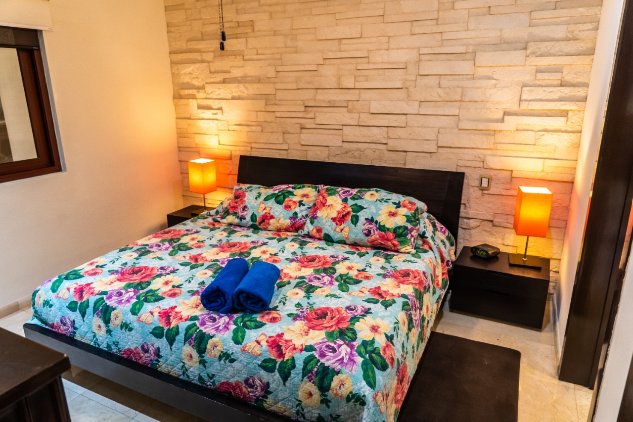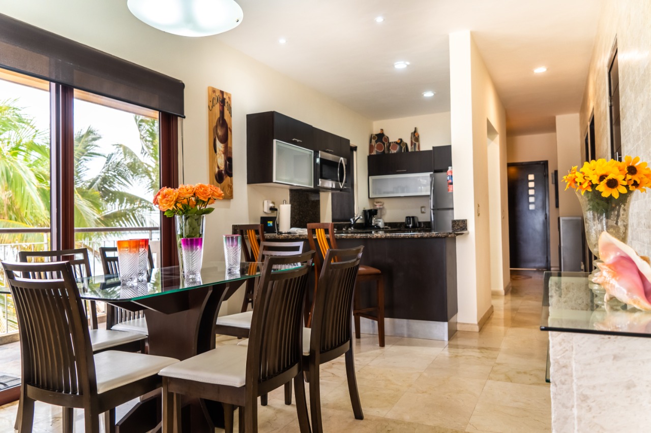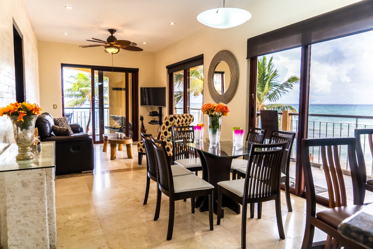 Un hermoso alquiler de vacaciones con 2 dormitorios y 2 baños; ¡Encaramado justo encima de la playa en la esquina delantera de El Faro! La terraza privada envolvente ofrece vistas panorámicas del cautivador mar Caribe y la piscina infinita y el área del jardĂn a continuaciĂłn. Amplia entrada principal, cocina moderna y comedor abierto con acceso a la terraza. El área de estar cuenta con TV de pantalla plana y sofá reclinable para una relajaciĂłn Ăłptima. Bellamente decoradas y amuebladas para que se sienta como en casa, con paredes pintadas con textura, colores brillantes y acentos tribales. ¡Disfruta de la brisa del mar y el suave sonido de las olas que bañan la orilla mientras preparas la cena! Ambas habitaciones cuentan con televisores de pantalla plana montados en la pared y baños contiguos con duchas de lluvia. ¡Vea increĂbles amaneceres caribeños desde la comodidad del dormitorio principal! Las comodidades del edificio incluyen piscina, terapia de masajes, lavanderĂa y estacionamiento subterráneo reservado. CĂ©ntricamente ubicado en Playa del Carmen; ¡a una cuadra de la famosa 5thAvenue con infinitas opciones de compras, restaurantes y entretenimiento! Los pisos de mármol travertino se extienden hacia su terraza privada al aire libre, la cocina de acero inoxidable totalmente equipada del chef con encimeras de granito, pinturas originales y muchos otros detalles finos, todo para brindar una calidad impecable y un estilo internacional. Incluso la terraza está amueblada con el mejor confort al aire libre para descansar y cenar al aire libre. El patio del área comĂşn tiene hermosos paisajes de palmeras, plantas tropicales, flores y una gran piscina refrescante de borde infinito y bañera de hidromasaje. Se proporcionan mesas y salones al aire libre complementarios para relajarse y entretenerse alrededor de la piscina. 1 King size en la recamara principal y 1 Queen Size en la segunda recamara (Tarifa de estacionamiento: $15 USD por noche)